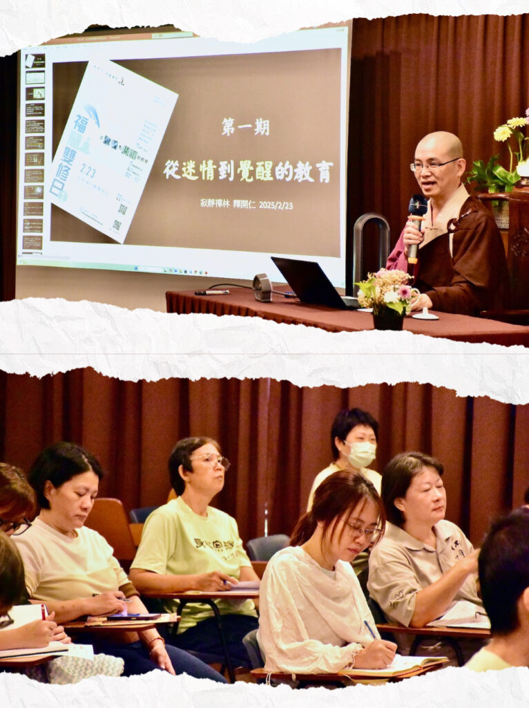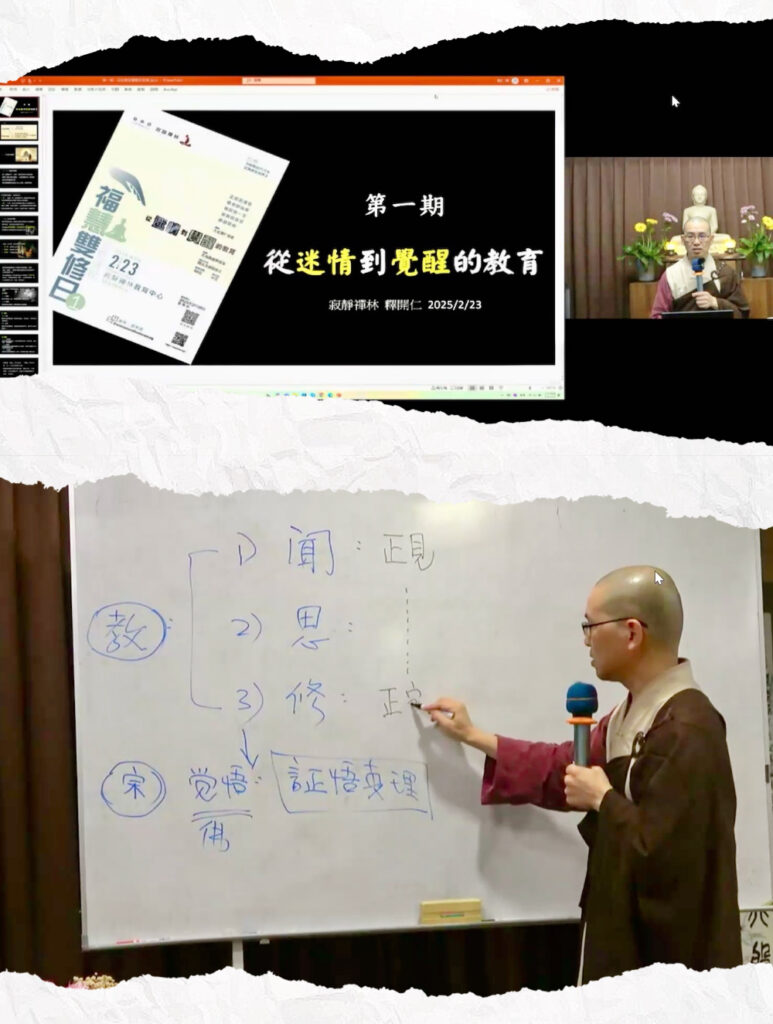 為了接引初學者以輕鬆無壓力的方式來認識佛敎與佛法,寂靜禪林方丈開仁長老特意規劃了「從迷情到覺醒的教育」系列的網路及實體課程。此活動將分為四個階段,兩年的時間進行。第一階段「福慧雙修日1」已於2025年2月23日(星期日)假寂靜禪林的教育中心圓滿進行。共有3位僧眾及約30餘位佛友齊聚教育中心歡喜參與。