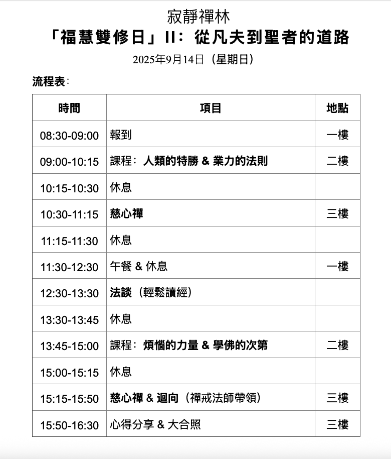 1. 佛法難聞,請全程參與,並避免遲到早退,培養對法和講師恭敬之心態。