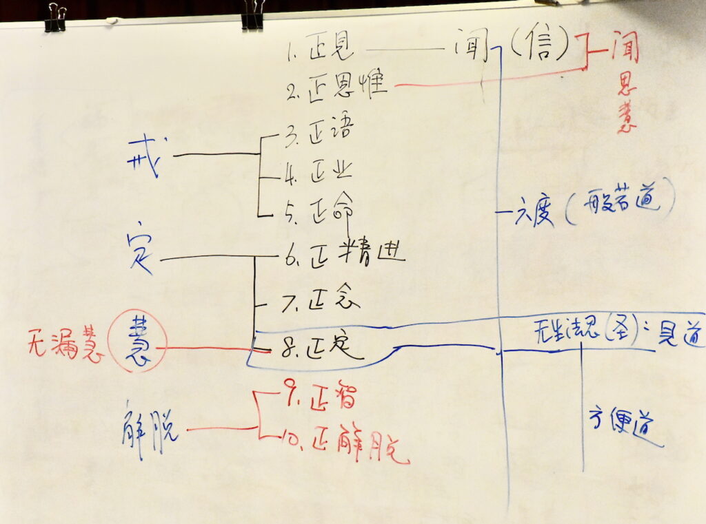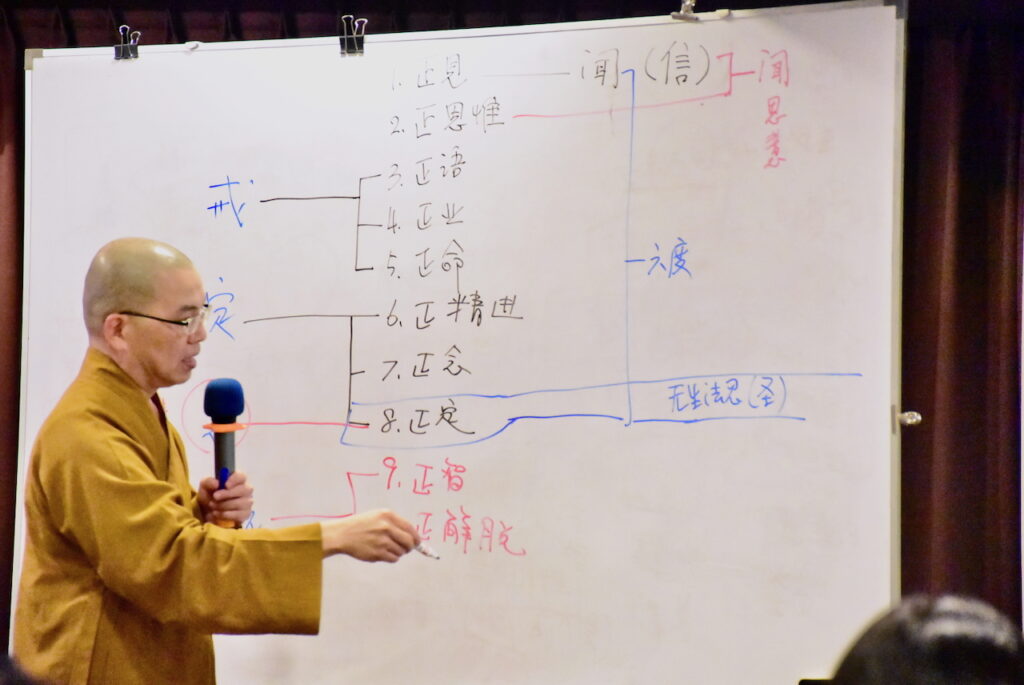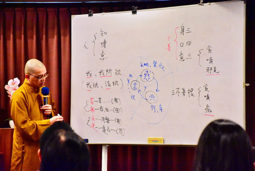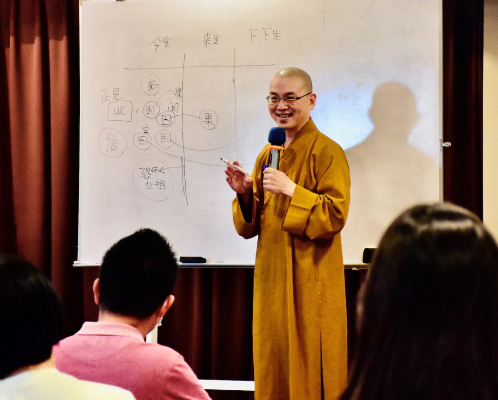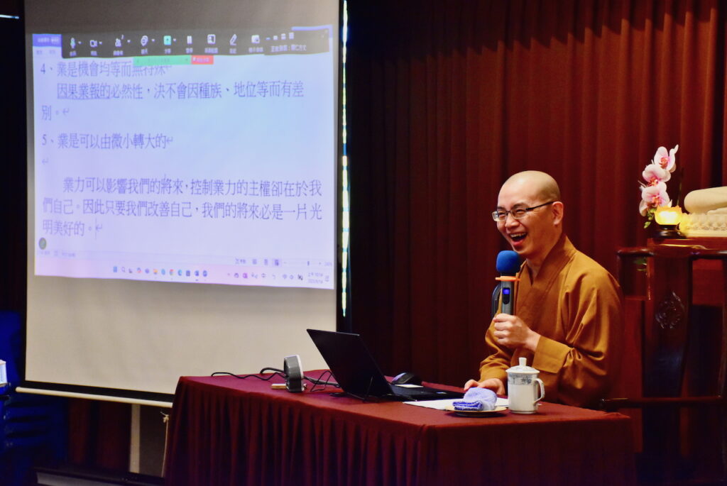 課程後半段進一步探討「煩惱的力量」與「學佛的次第」。開仁長老指出貪、瞋、癡為三不善根,能引發惡業與苦果,繼而介紹學佛之次第,強調從持戒、修定至證慧的修行道徑,並概述十善業、三端正法、五法具足、四預流支等具體實踐方法,指引學員邁向解脫。