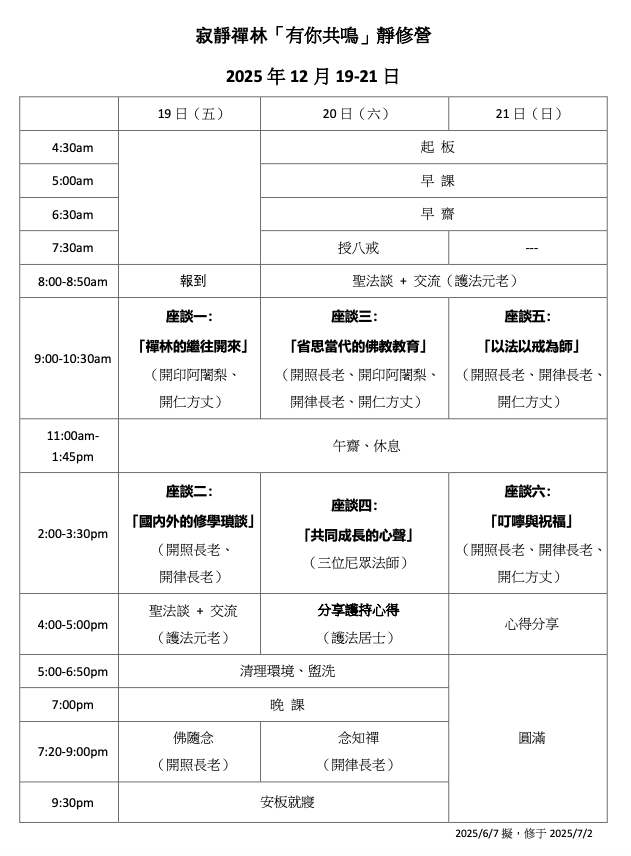 講師及與談人:開照長老、開印阿闍梨、開律長老、開仁方丈、禪戒比丘尼、禪正比丘尼、禪念比丘尼、護法眾。