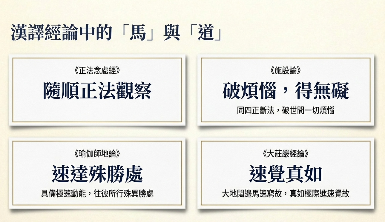4、《大莊嚴經論》卷 10〈21 覺分品〉:「第三精進覺分與馬寶相似,大地闊邊馬速窮故、真如極際進速覺故」。