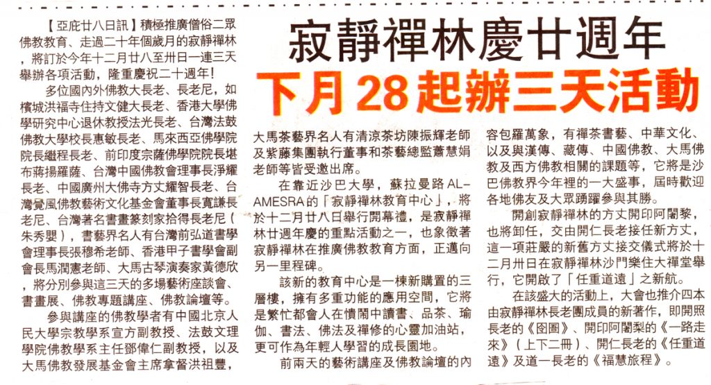 【亞庇廿八日訊】積極推廣僧俗二眾佛教教育、走過二十年個歲月的寂靜禪林,將訂於今年十二月廿八至卅日一連三天舉辦各項活動,隆重慶祝二十週年!