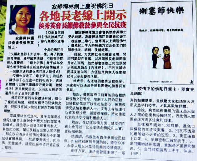 據寂靜禪林護法會會長侯秀英博士受訪時稱,寂靜禪林佛陀日慶典如去年一樣在線上舉行,信眾可以上網浴佛外,還能於上午九時透過點擊寂靜林面子書的頁面,聆聽方丈及長老們的開示佛法、唱誦、及誦經等。