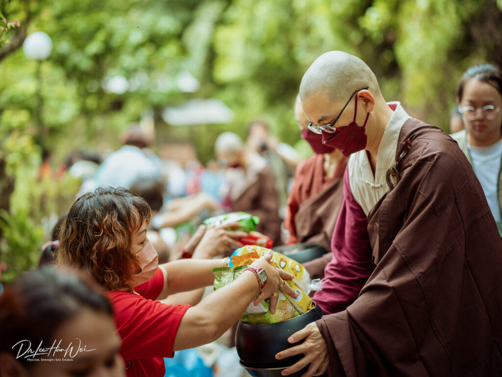 2023年的佛陀日,共有七名出家眾在當天托缽儀式上接受約四百餘位信眾的供養。這是寂靜禪林在闊別三年後,重啓實體的慶典,也讓信眾再次能夠親手將自己的供品放到出家眾手中的鉢,實是讓人感動的一天。開仁方丈在開示時也說:我們都是在COVID疫情幸存下來的一群,還能有機會以法在此相聚,確實非常感恩所有促成的善緣。方丈勸誡信眾要珍惜,增上自己的善根。但是善根要如何增上呢?方丈以中部第5經,舍利弗尊者的比喻來跟大家說明。我們的內心如果有很多不善的心念,沒有清除、轉化,就好像一個骯髒的鉢放在滿是灰塵的庫房,不去清洗,到最後,這個鉢就會越來越髒,甚至最後破損,失去使用的功能。
