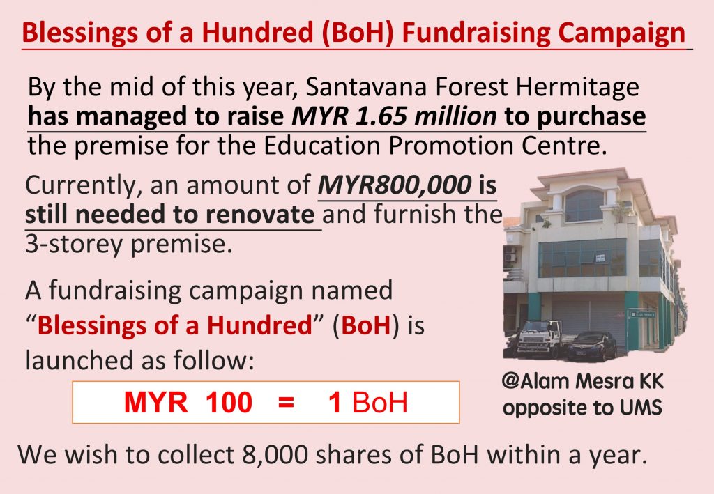 A fundraising campaign named “Blessings of a Hundred” (BoH) is launched as follow: MYR 100 = 1 BoH