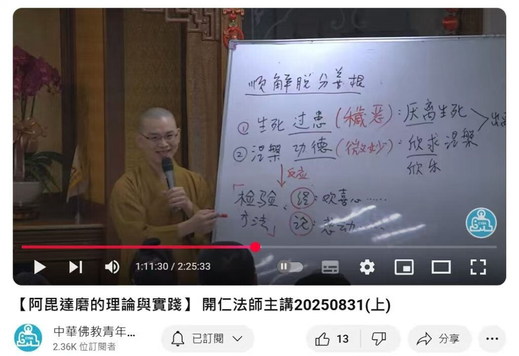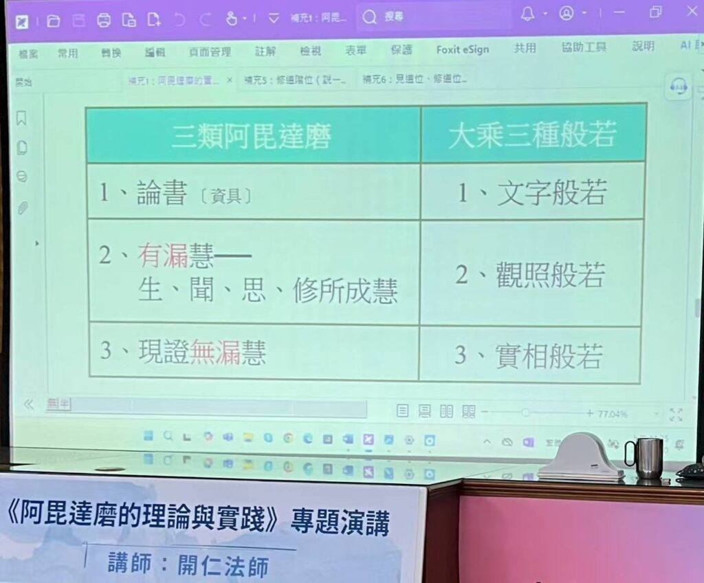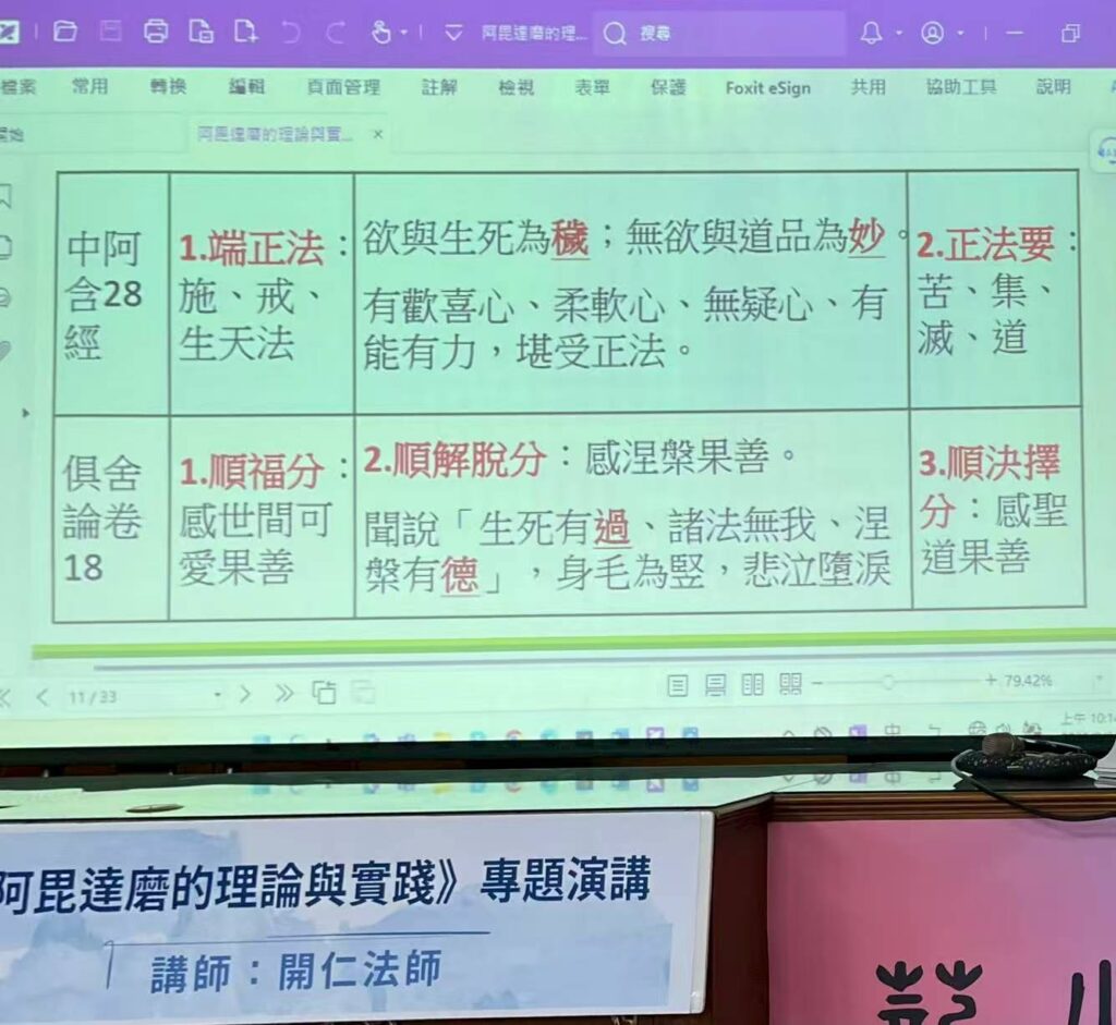 首先,第壹章引用印順導師對阿毘達磨的研究,導師提到「阿毘達磨以聖道的實踐為主」,開仁法師開釋:「以實踐為目的,才能稱阿毘達磨。如果只是做學問的話,不能稱作阿毘達磨」。多麼敲響警鐘的一句話!如我年紀不小,若學佛還不重視能否行?如何行?那請問何年何月才要考慮將佛法落到日常、落到修行實踐當中,看來現在對於教法與行持並重的選課態度,是無誤的。