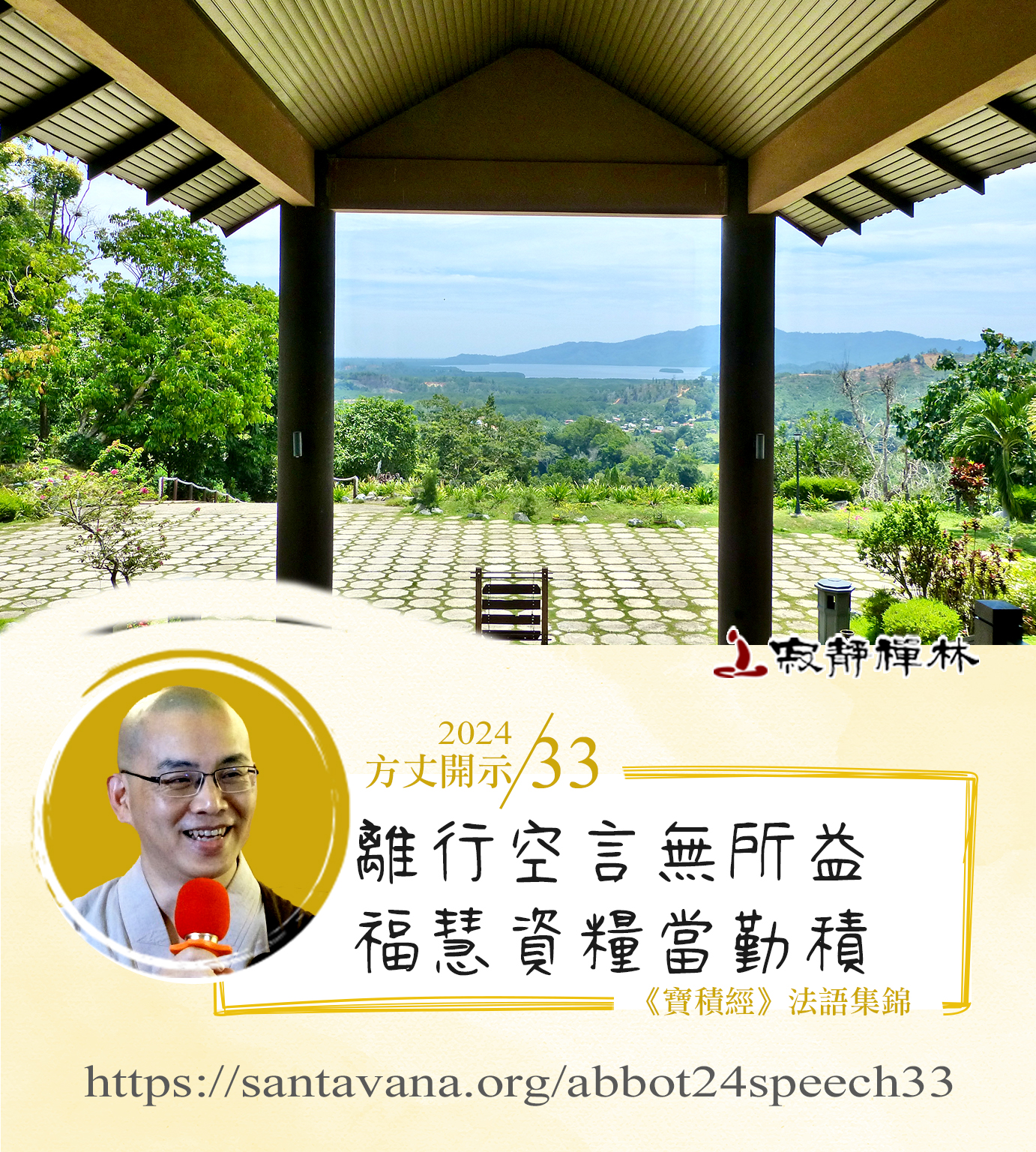 一向專在義理上著力的人,常常會說他自己懂得很多道理,能夠講什麼經、什麼論。但是,按照導師的解釋,其實他用這樣的說法來掩飾自己「空言無行」的毛病。比如,按規定,我們出坡要到下午四點。快要到下午四點的時候,他就開始等著打板,要休息了。我以前的很多同學也是這樣的。或者一到時間了,掃地掃到一半,他也停下。他說:「音樂鐘響了,休息了,這個明天再掃。」如果你吃飯吃到一半,我跟你說:「時間到了,你不要吃,放著明天再吃,可以嗎?」