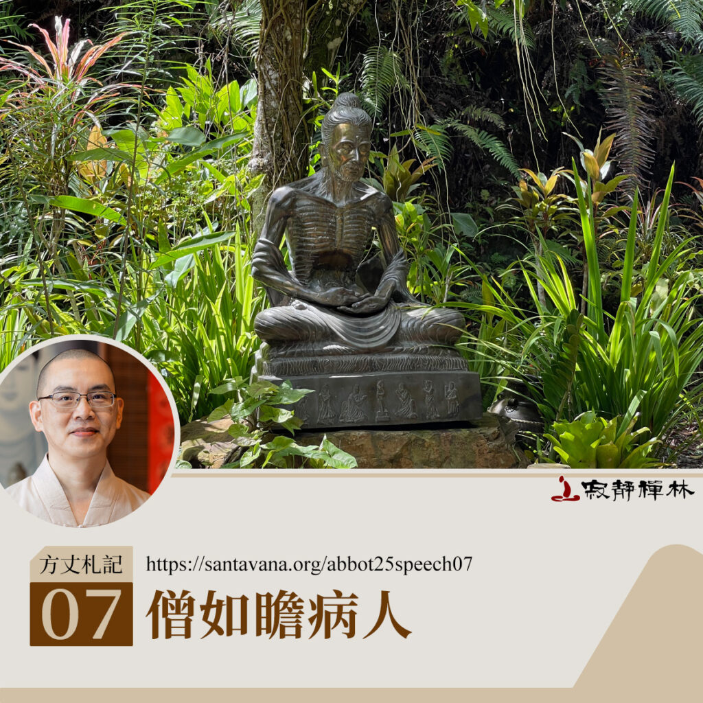 佛陀如大醫王,佛法如良藥,僧寶如看護者。瞻病人就是現在講的護理人員。每個眾生都有輪回的病,所以僧寶是有情的護理人員,是我們斷諸煩惱病的一個因緣,所以應念僧。在我們的修道過程中,僧寶是一個善緣,佛陀是大醫王,他給的法藥這麼好,不懂得運用的話,對看護我們的僧寶不懂得感恩的話,實際上我們是一個病得很嚴重的人,自己不知道。
