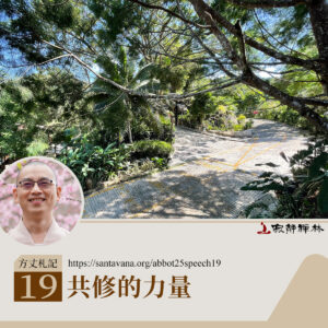 大家住在僧團要好好的安住,不斷學習成長,這個是很重要的。因為資糧如果不夠的話,千萬不要離開僧團。雖則說在僧團裡面,難免會有人事問題,也比較累,但是善法會比較多,懈怠會比較少,你不走,別人也會推著你走。