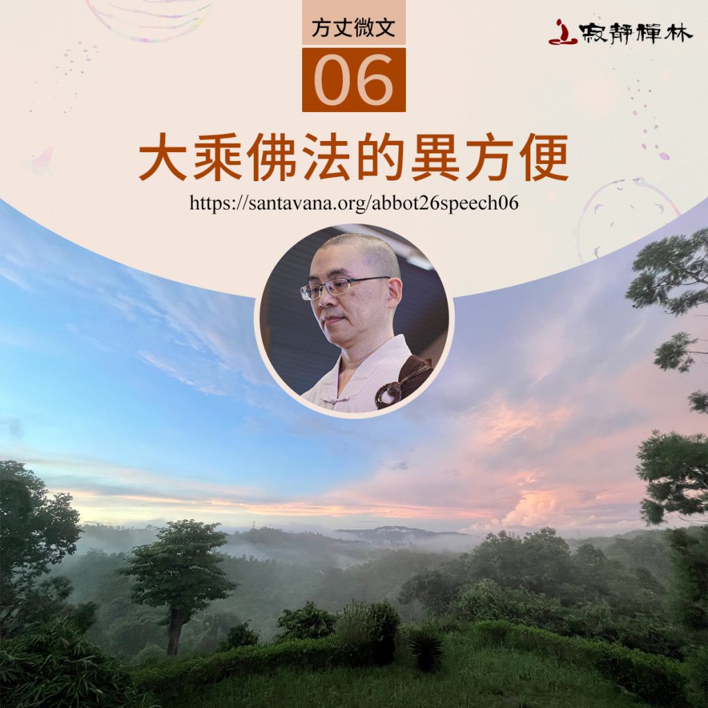 大乘佛法的應運盛行,帶來新的方便適應。像《法華經》提到說「更以異方便,助顯第一義。」第一義就是真義,就是空性的意思。「異方便」是什麼呢?異是特殊的意思,特殊的方便──就是大乘佛法有一些特殊的方便,是佛陀時代可能沒有的,但在佛法的流行,這種特殊的方便,它卻可以説明顯示這個真理的第一義,也可以被納進來。
