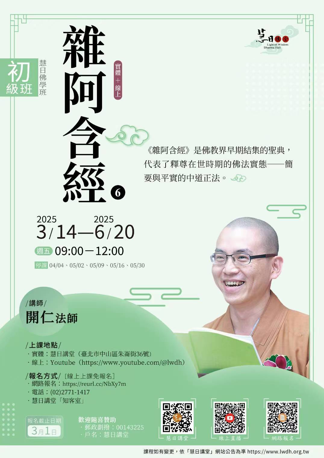 9月19、26日,10月3、24日,11月7、21、28日,12月12日(五) 9a.m.-12p.m. 主講《雜阿含經》第七期[實體及YouTube網絡課程] 於 台灣 台北 慧日講堂 海報 直播連結: 9/19、9/26、10/03、10/24、11/07、11/21、11/28 及 12/12 NEW