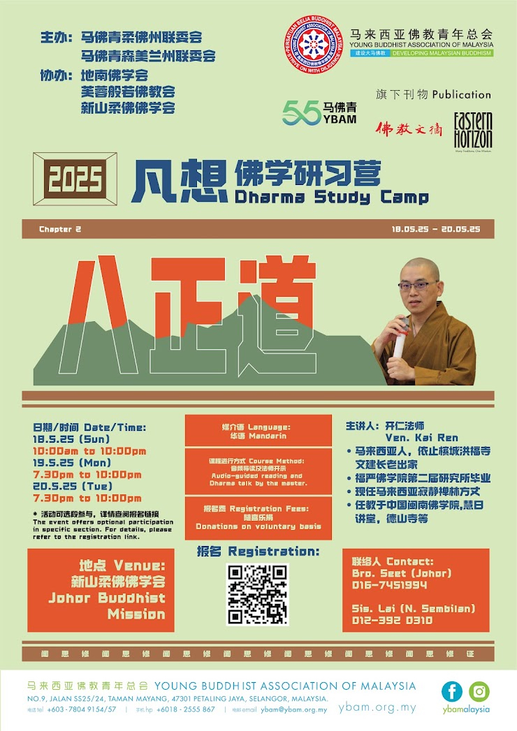 5月18日(日)-20日(二)主持 「八正道 -『凡想』 佛學研習營」 於 馬來西亞 柔佛 新山,由 馬佛青柔佛州聯委會 與 馬佛青森州聯委會聯辦,地南佛學會、芙蓉般若佛教會及新山柔佛佛學會協辦。 海報