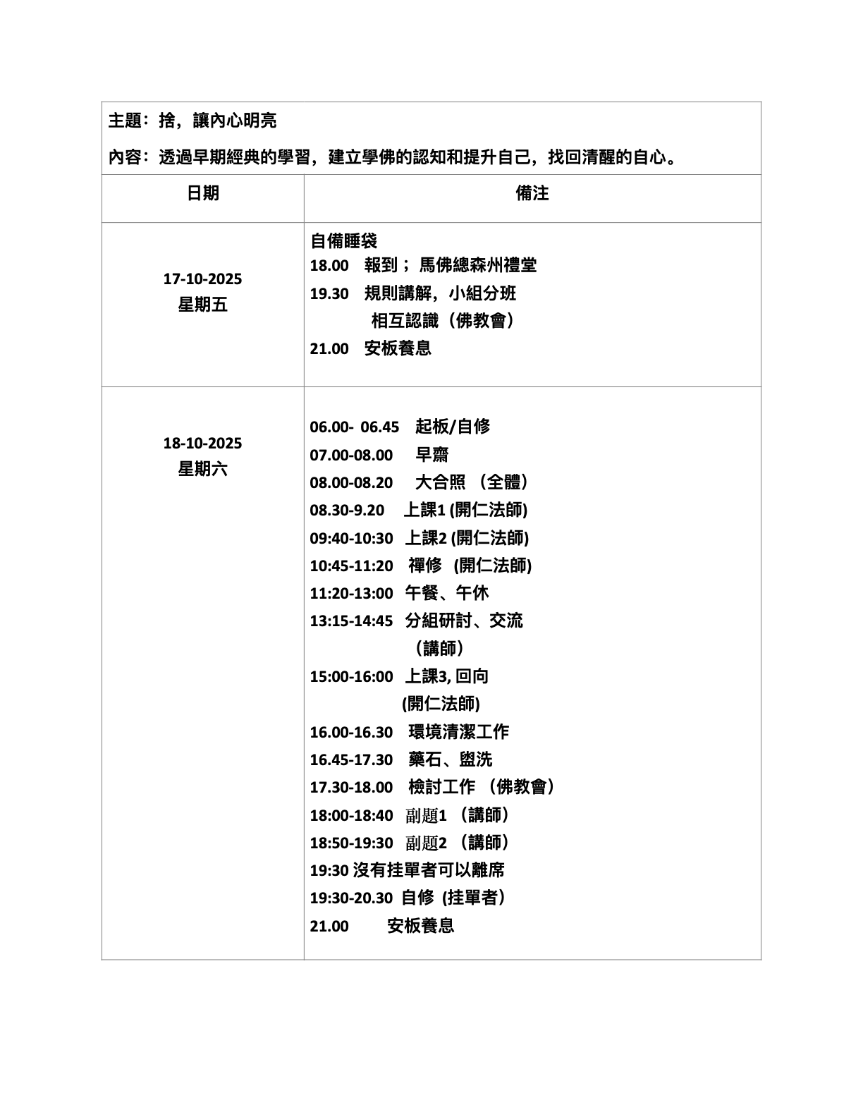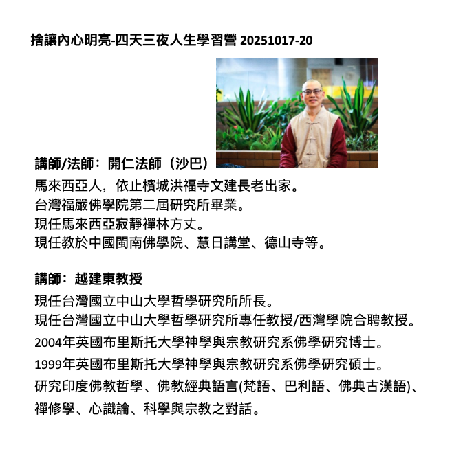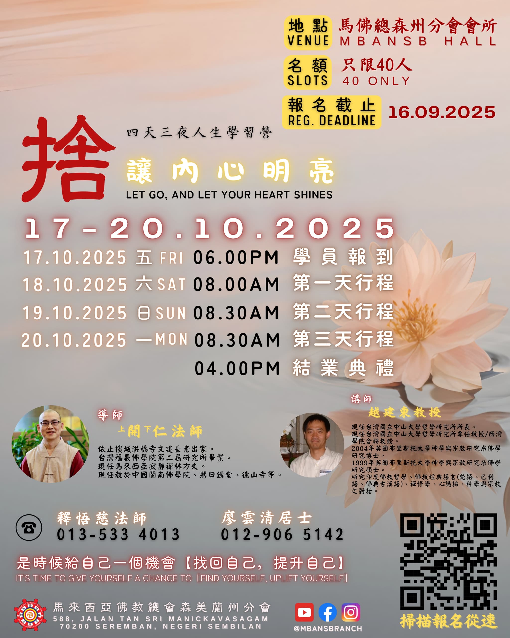 10月17日(五)-20日(一) 主持「捨,讓內心明亮」課程@ 馬來西亞 森美蘭州 (馬來西亞佛教總會森美蘭州分會 主辦)文宣 1 2 3 4
