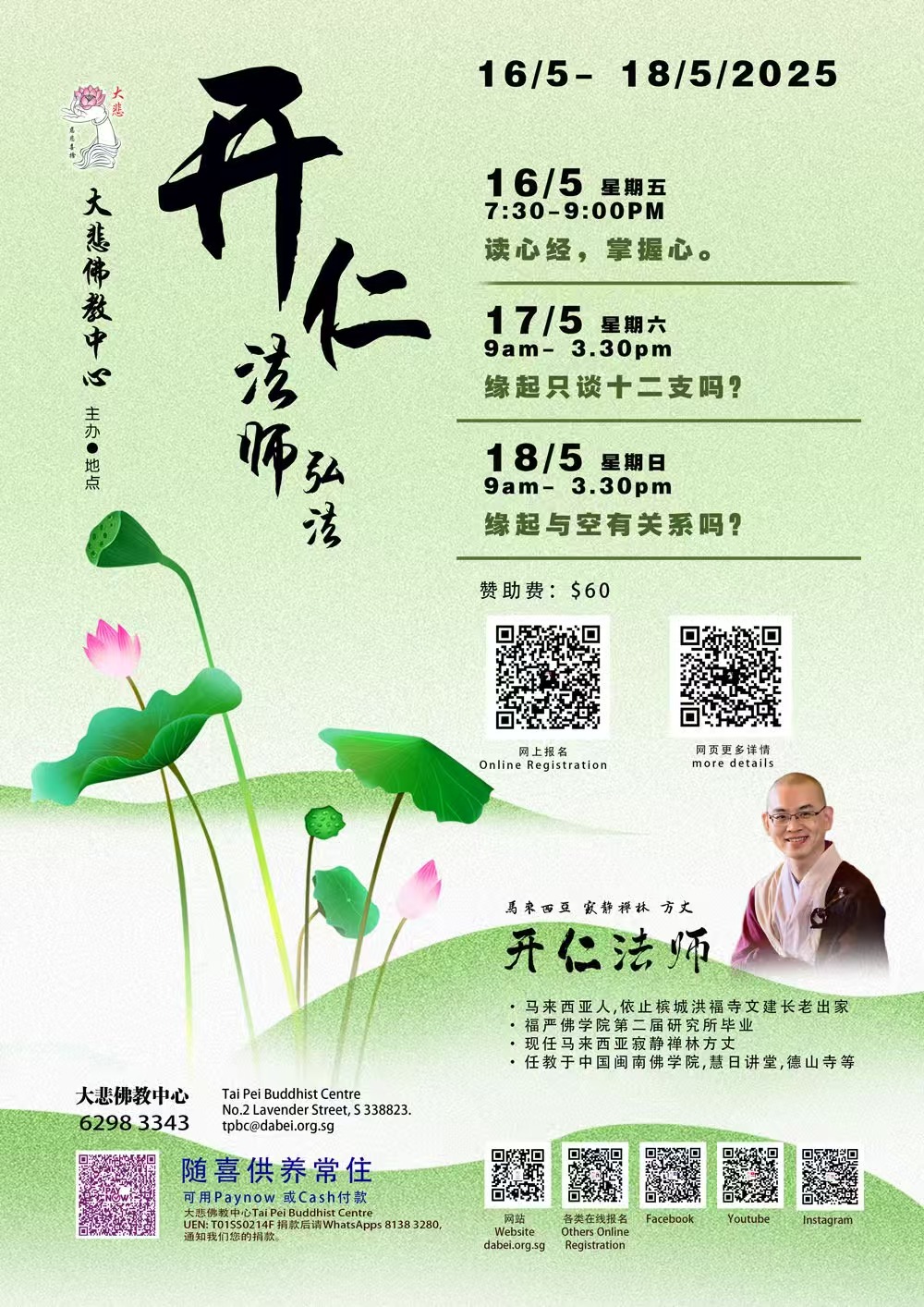 5月17日(六) 9a.m.-3:30p.m. 主講「緣起只談十二支嗎?」 於 新加坡 大悲佛教中心 海報
