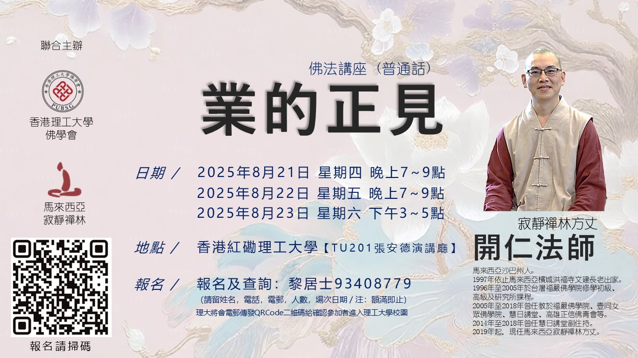 8月21日(四)-23日(六)開示「業的正見」 於 香港 紅磡理工大學 海報