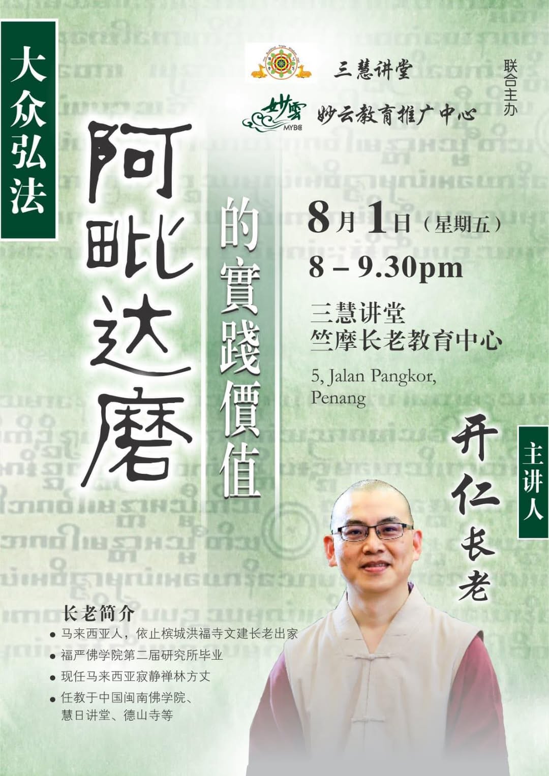 8月1日(五)8p.m.-9:30p.m.主講「阿毗達摩的實踐價值」 於 馬來西亞 檳城 三慧講堂 竺摩長老教育中心(三慧講堂&妙雲推廣教育中心主辦)