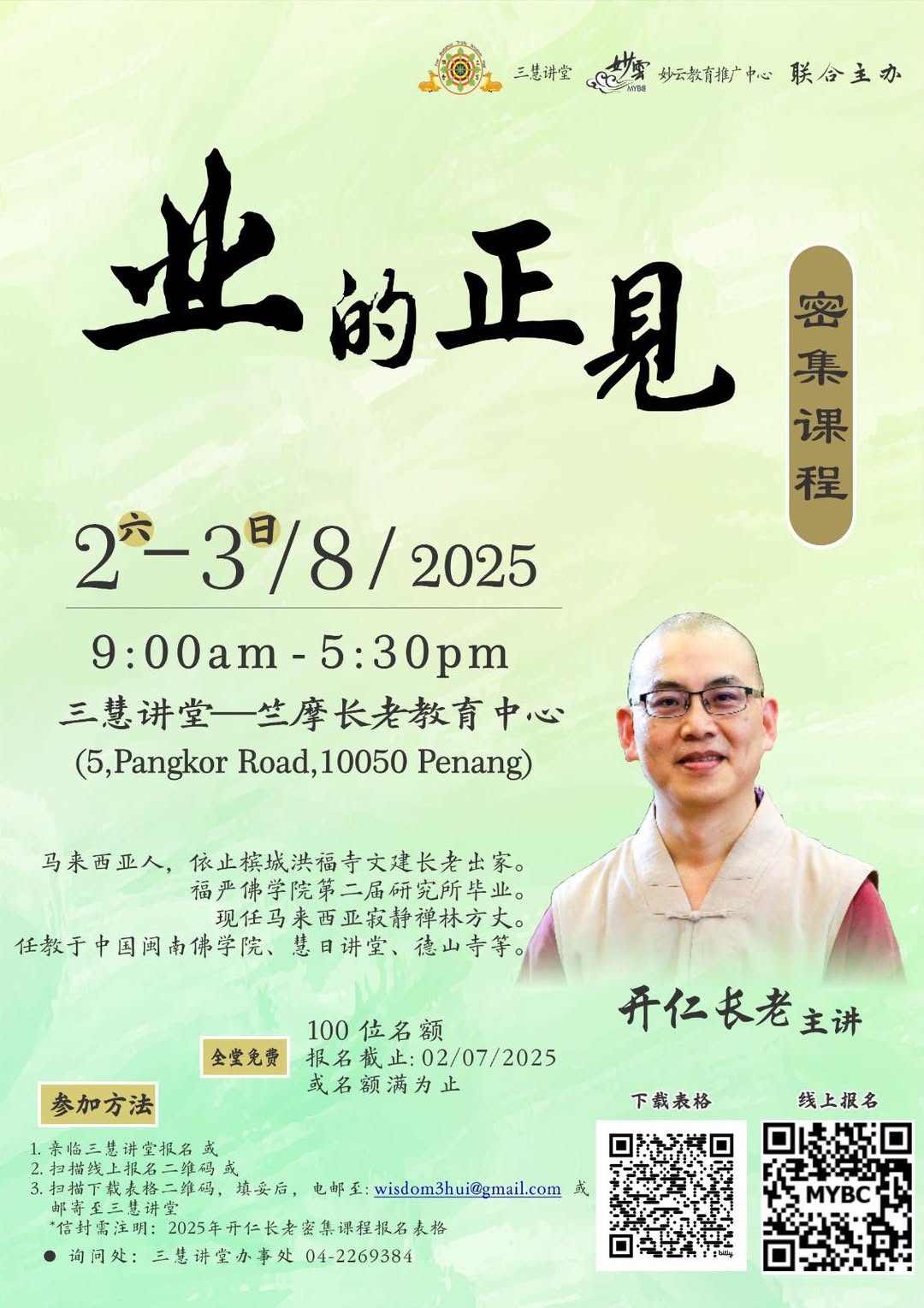 8月2日(六)、3日(日)9a.m.-5:30p.m. 指導「業的正見」 於 馬來西亞 檳城 三慧講堂 竺摩長老教育中心(三慧講堂&妙雲推廣教育中心主辦)