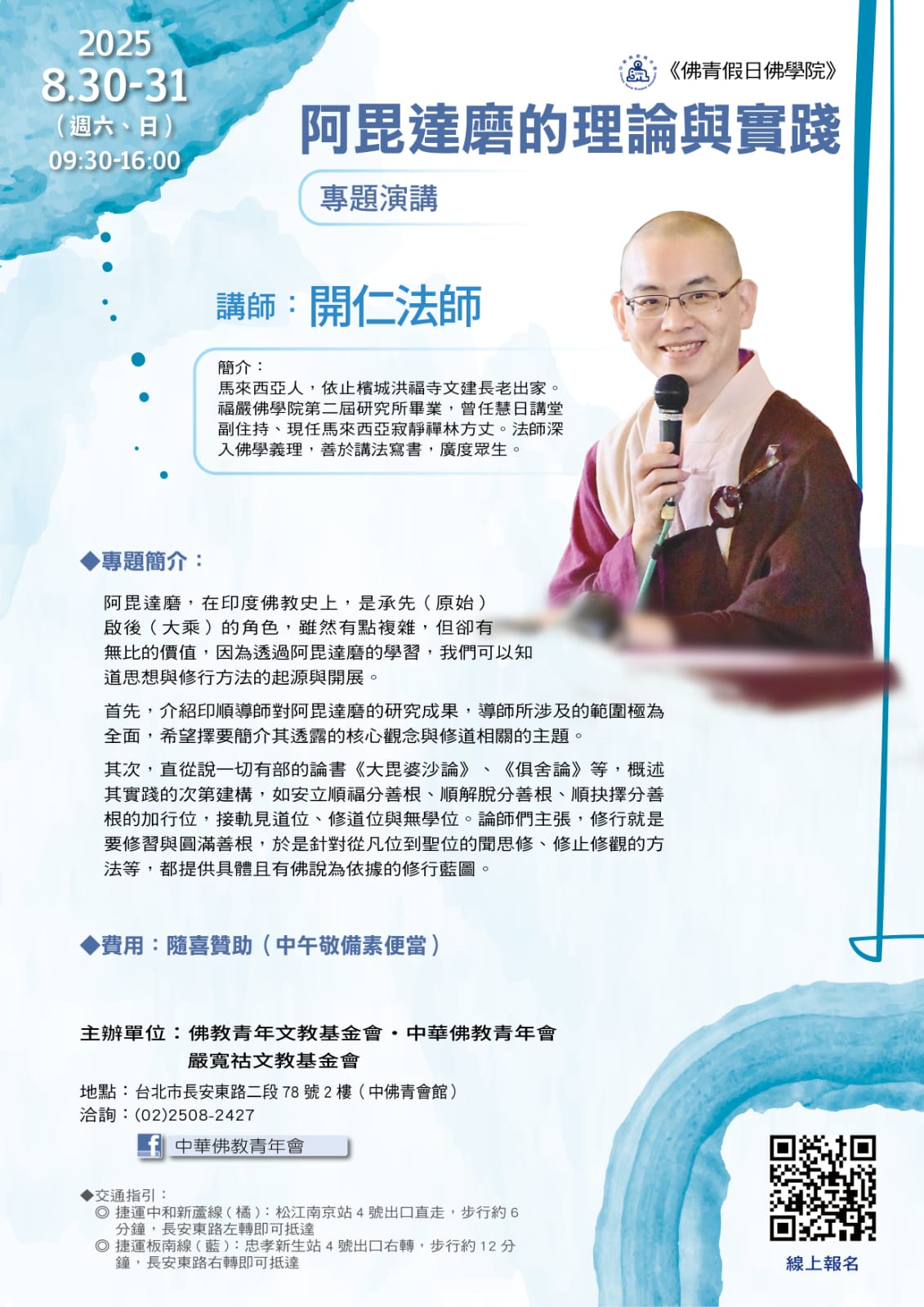 8月30日(六)-31日(日)主講「阿毘達磨的理論與實踐」於 台灣 台北 中青年會會館 海報