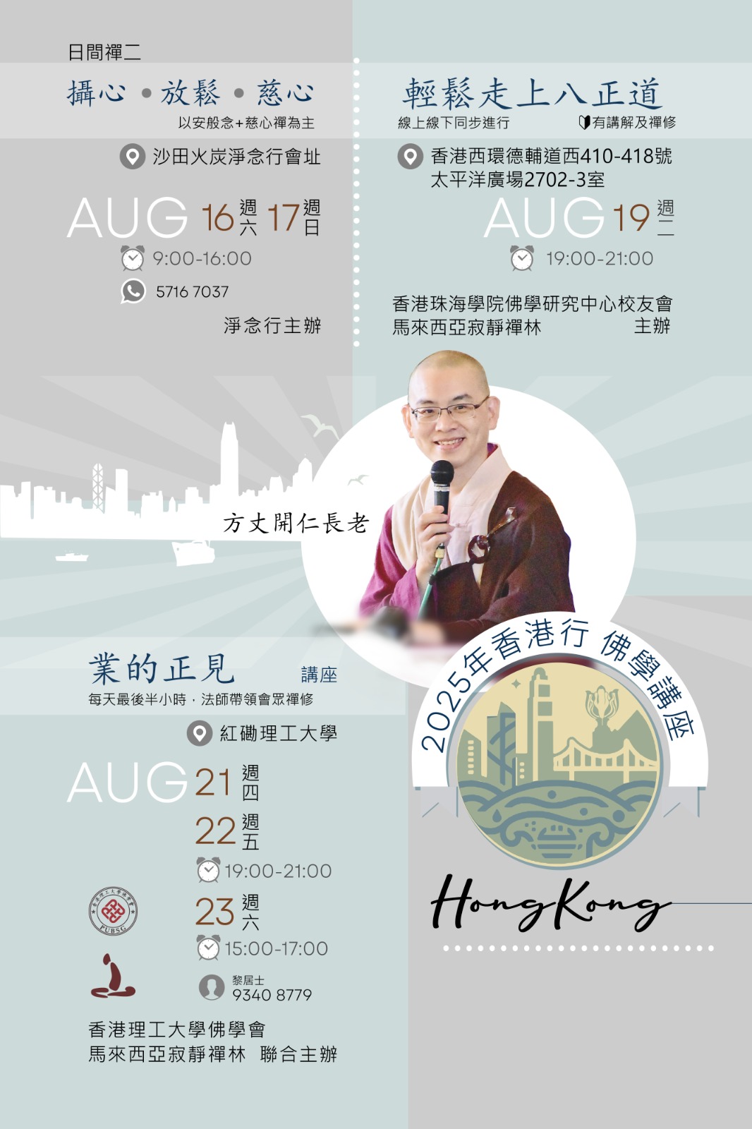 8月19日(二)7p.m.-9p.m. 指導「輕鬆走上八正道」(講解及禪修)於香港 西環德輔道西410-418號 太平洋廣場2702-3室 (線上線下同步進行)