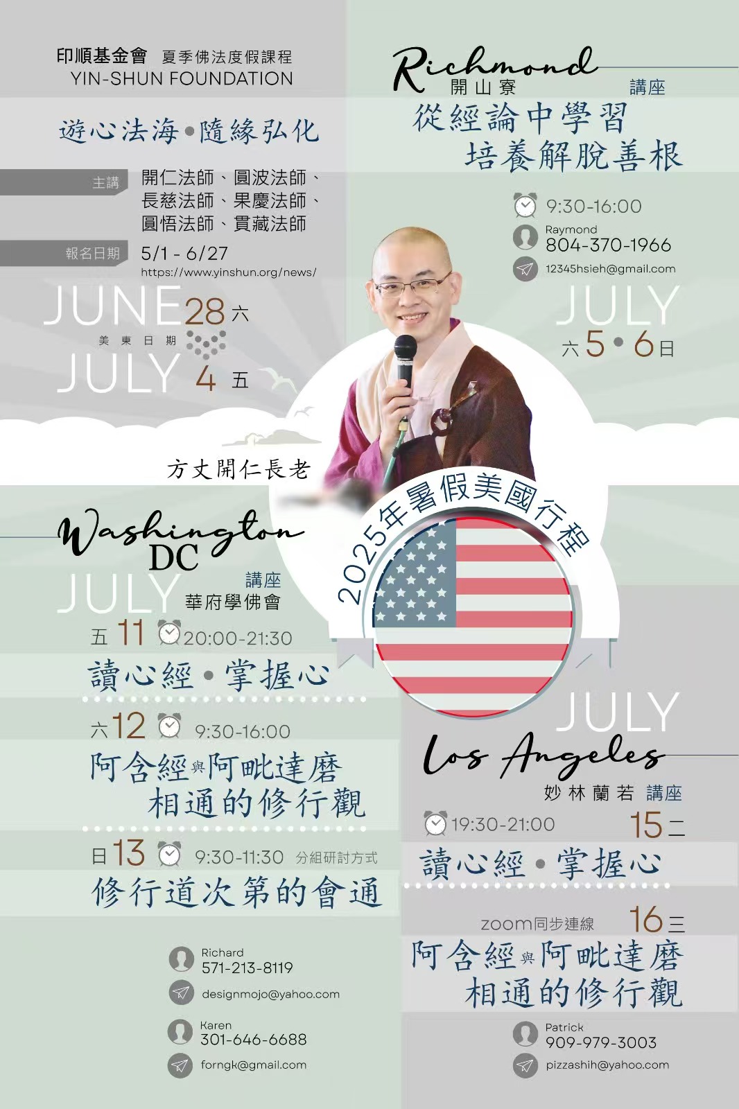 7月13日(日)9:30a.m.-11:30a.m. 主講「修行道次第的會通」於 美國 華盛頓哥倫比亞特區(Washington DC) 華府學佛會