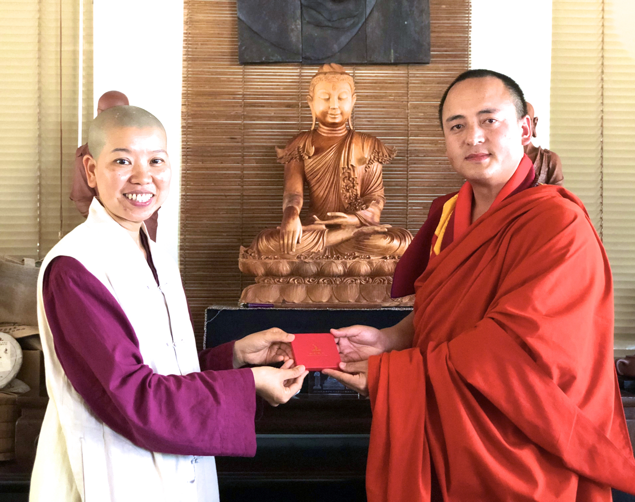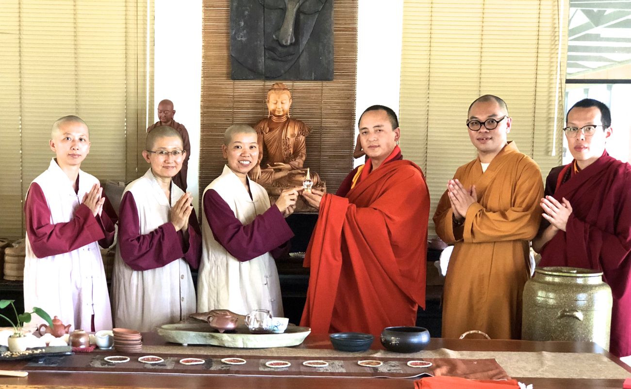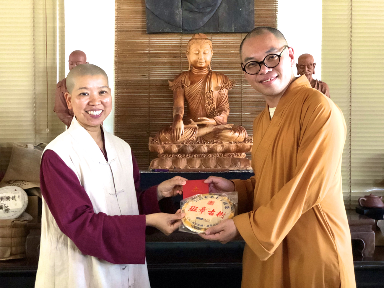 在短短幾個小時的來訪,除了參訪圖書館及禪堂,眾人也有作短暫交流。在此分享一段Khenpo的開示:善的念頭引生善的言語行為及帶來善果,反之,惡的念頭引生惡的言語行為及帶來惡果,所以,要時時審查起心動念。親切的Khenpo也贈送一小舍利塔內裝有佛陀舍利子衍生及紅花給予寂靜禪林及定覺比丘也贈送一餅普洱茶給予寂靜禪林,sādhu!