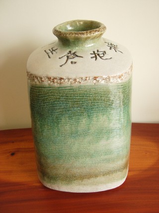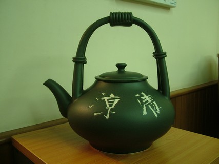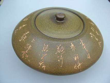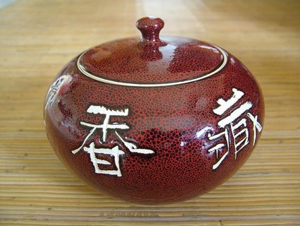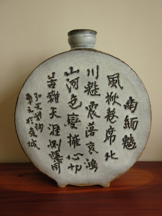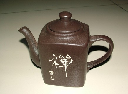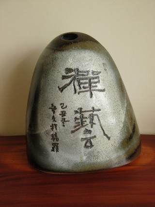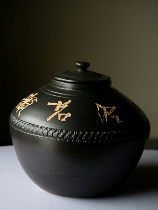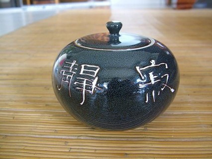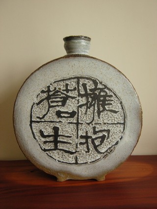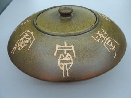 書藝20個展結束後,開印比丘赴英國前刻的陶器「善在尊師」。
