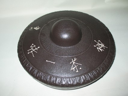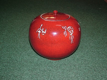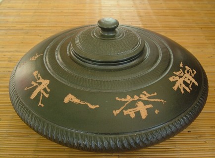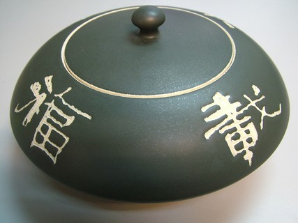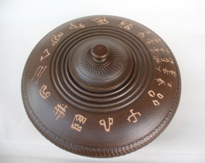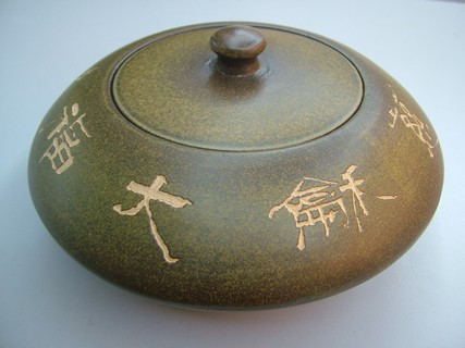 釋文:毛公鼎金文「善在尊師」。庚寅年正月十六日,書藝二十後,章元於順意成。 說明: 書藝20個展結束後,開印比丘赴英國前刻的陶器「善在尊師」,與先前一樣採用古銅綠釉,但改紅土製作(非黃土,或白土),另類的效果。