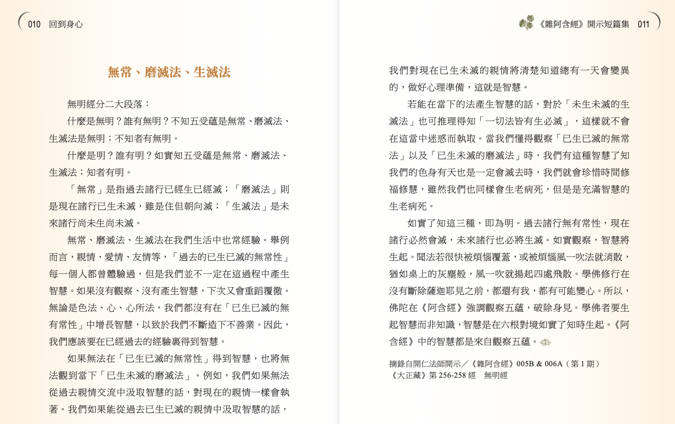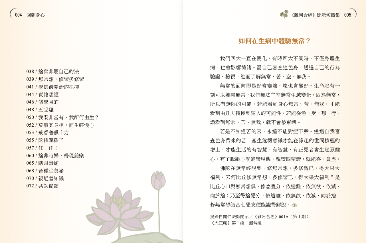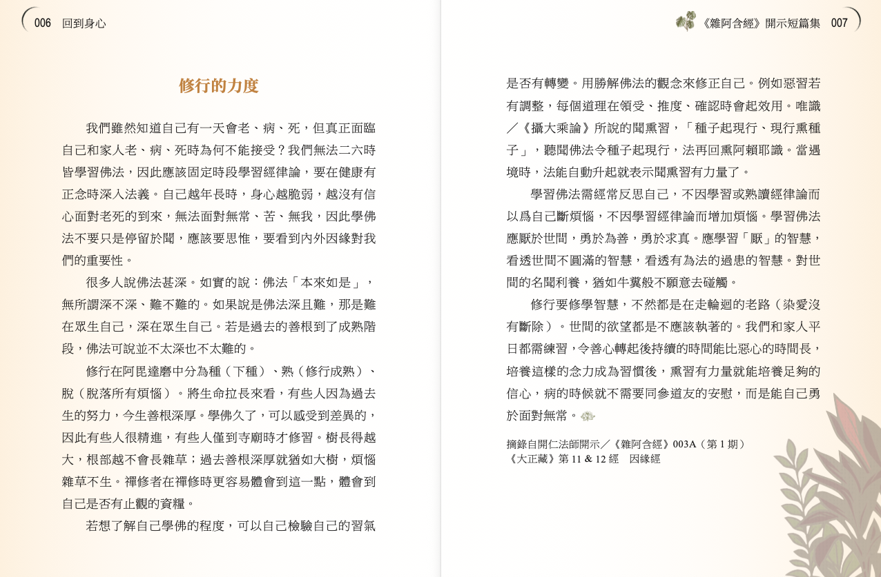 習講《雜阿含經》,猶如一次又一次親聆釋尊向自己開示正法,提醒自己莫忘初心──修習梵行的動機與核心,並以精要的話語指出一條處理煩惱的途徑。