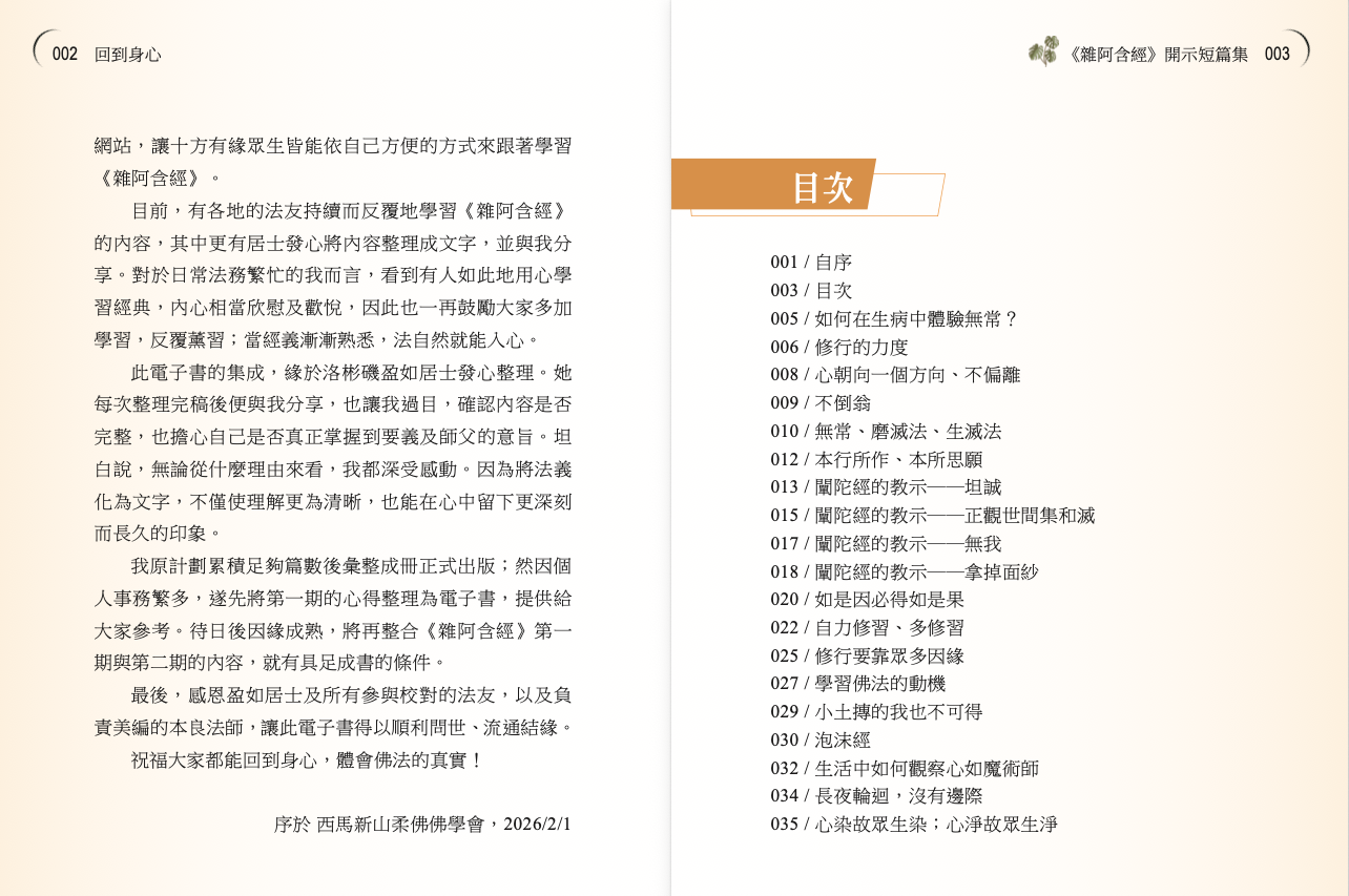 此電子書的集成,緣於洛彬磯盈如居士發心整理。她每次整理完稿後便與我分享,也讓我過目,確認內容是否完整,也擔心自己是否真正掌握到要義及師父的意旨。坦白說,無論從什麼理由來看,我都深受感動。因為將法義化為文字,不僅使理解更為清晰,也能在心中留下更深刻而長久的印象。