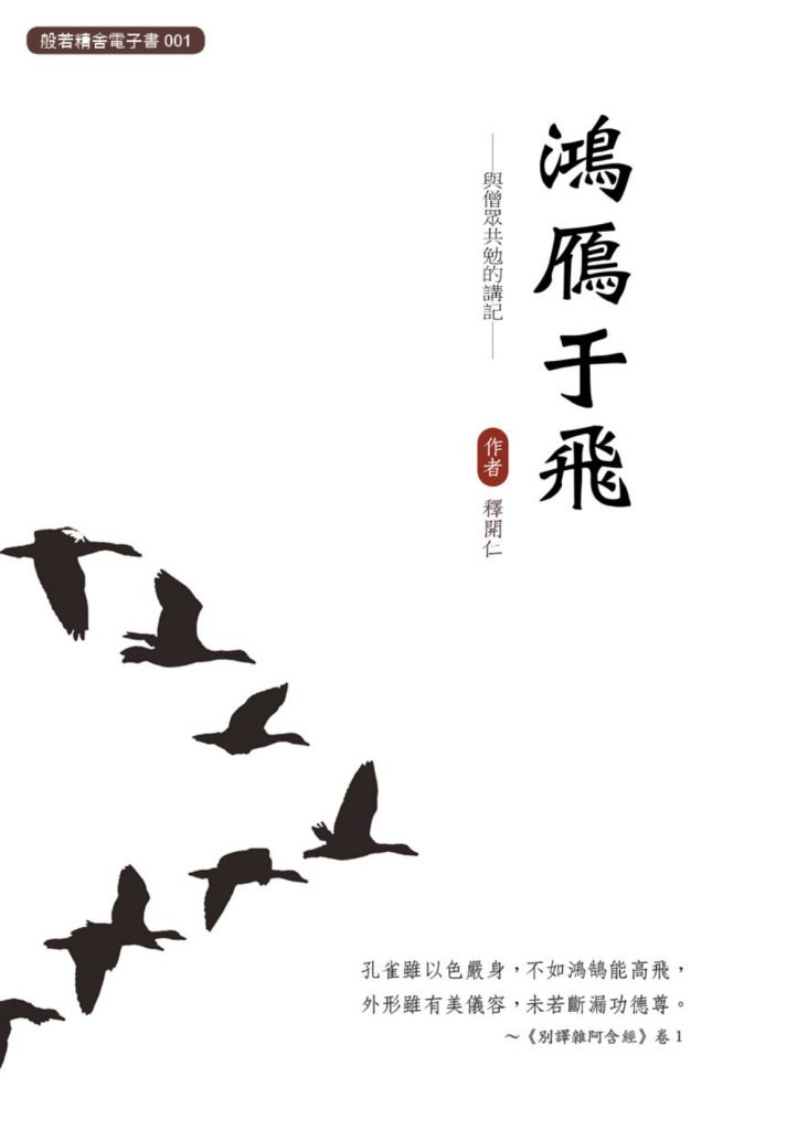 以前在讀《大智度論》時,就特別關注論主對僧衆或僧團的開示。每每談到出家功德時,許多人都有聽過如《大智度論》卷3〈1 序品〉的偈頌:「如偈說:『孔雀雖有色嚴身,不如鴻鴈能遠飛;白衣雖有富貴力,不如出家功德勝!』」(大正25,84b7-9)後來讀到《阿含經》時,才知道出自於《別譯雜阿含.2經》卷1:「爾時,世尊即說偈言:『孔雀雖以色嚴身,不如鴻鵠能高飛,外形雖有美儀容,未若斷漏功德尊。』」(大正2,374b2-5)頌義闡明鴻鴈或鴻鵠比孔雀自在灑脫、志向遠大,以此來形容「出家無家處處家」的無累心境。