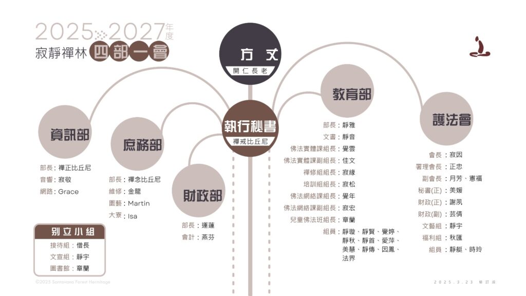 然而這些年來,禪林抱持著「實驗與改進」的態度,不管在僧信教育、組織管理、日常運作乃至活動籌備上等等,都一直努力地朝向制度化和穩定化,並且在「僧伽為導,白衣為輔」的原則下逐步演進。寂靜禪林組織架構中有多個單位。其中「教育部」、「資訊部」、「庶務部」及「護法會」為落實禪林理念之主力單位,協助管理層執行決策和推動法務。