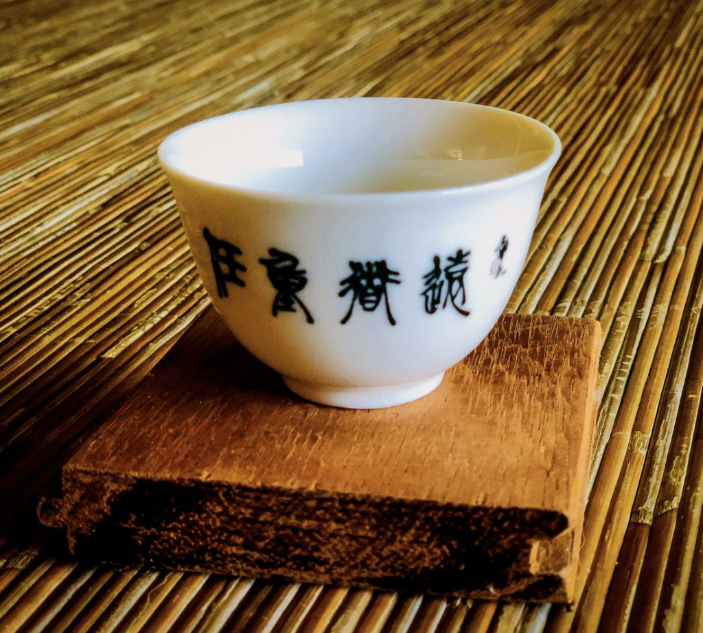 寂靜禪林廿週年慶任重道遠紀念茶杯是仿宋朝小茶杯。泥料是中國四大陶都之一的德化瓷土,以攝氏1300度燒製的德化瓷杯。又以白透、質堅、溫潤出名。此杯最宜顯茶湯色、及留香。