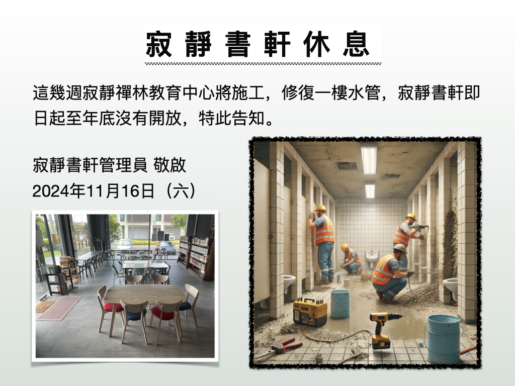 這幾週寂靜禪林教育中心將施工,修復一樓水管,寂靜書軒即日起至年底沒有開放,特此告知。