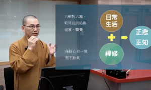 「正念、正知」可用於禪修方面也可以用到生活方面。如今天來聽講座,如何保持「正念、正知」?專心的聽。如果冷氣吹得太舒服了,而夢周公了,就沒有「正念、正知」了,也就是「失念」。