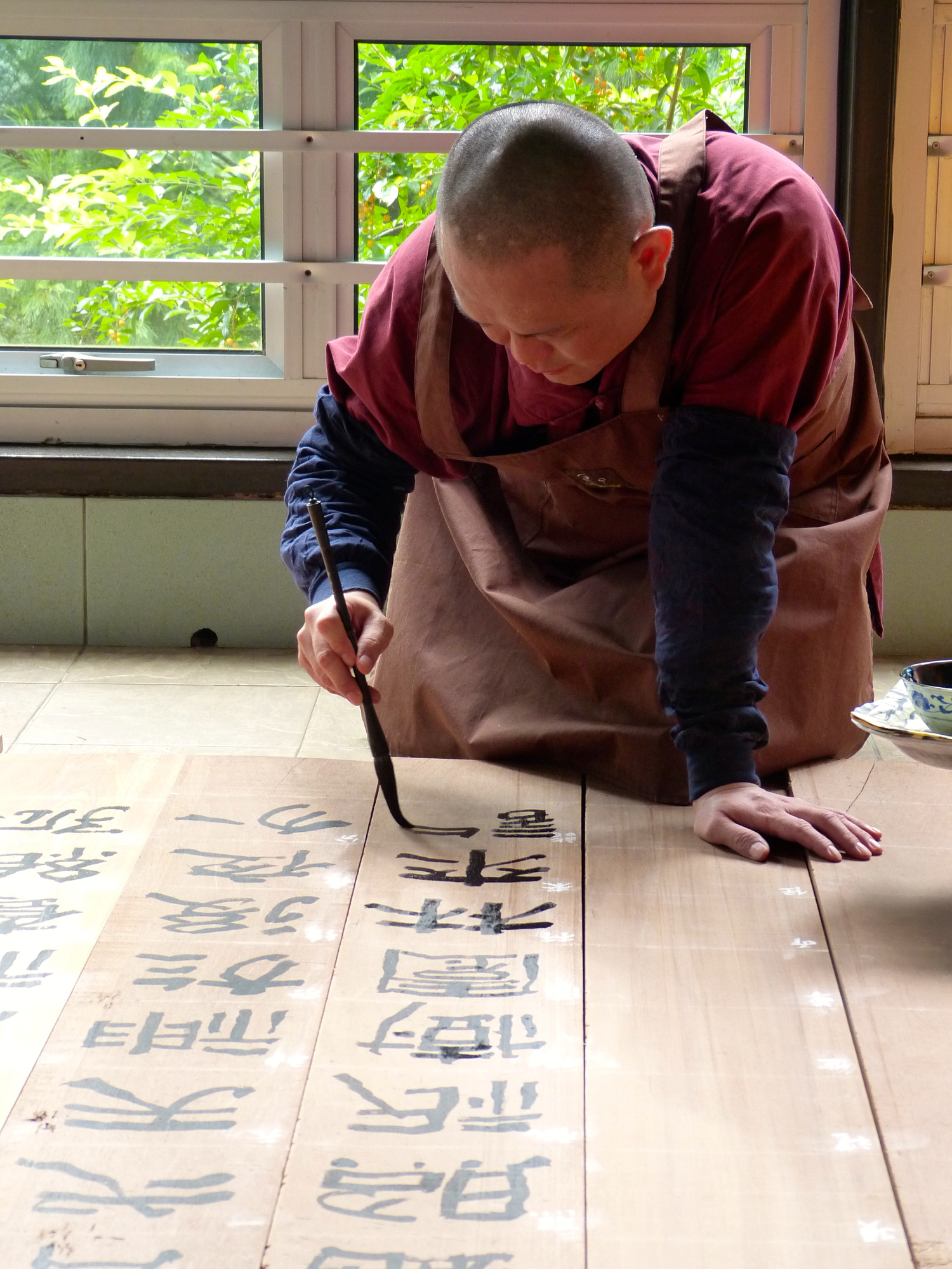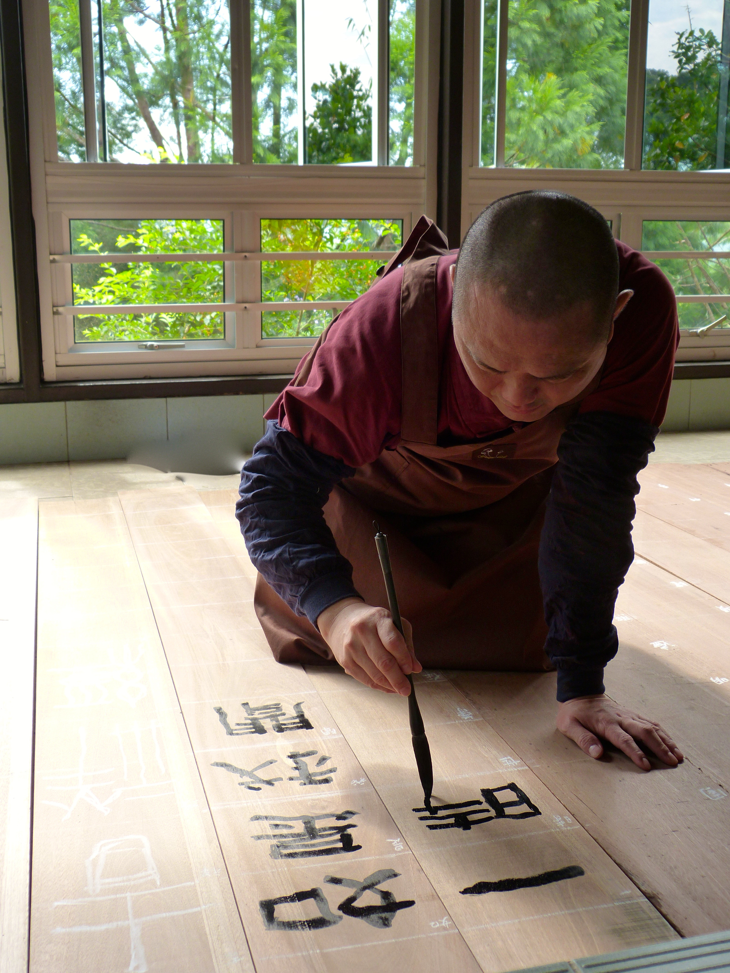 是日下午3.25pm,在悶熱的下午,開印阿闍梨在地上的木板書寫《吉祥經》。寫好之後,將會展在圖書館的講台。