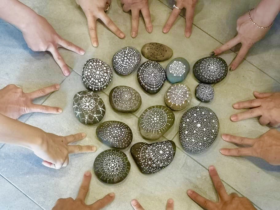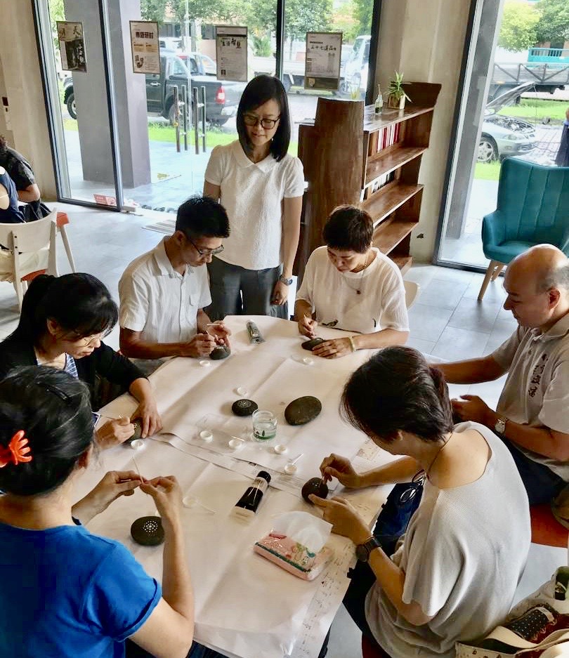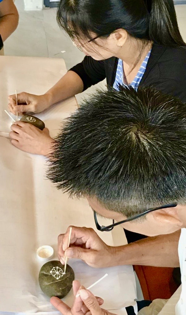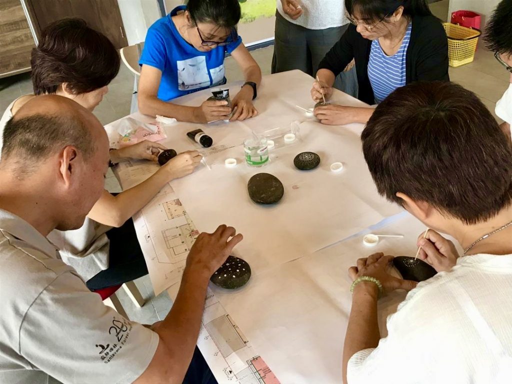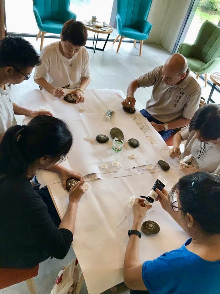 2019年12月15日,寂靜禪林文藝組舉辦【石上的內心密碼──手繪曼陀羅工作坊】,聚集了11位學員。靜宇老師簡單介紹了課程緣起後,就示範了手繪顏料在石上;有別與一般紙張或畫布。第一次接觸作畫在石上的學員,都用心的發揮創意,各自一小時內完成了作品。課程結束後,大家歡喜的彼此欣賞各自的「石上曼陀羅」及合照作紀念。
