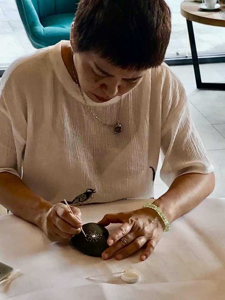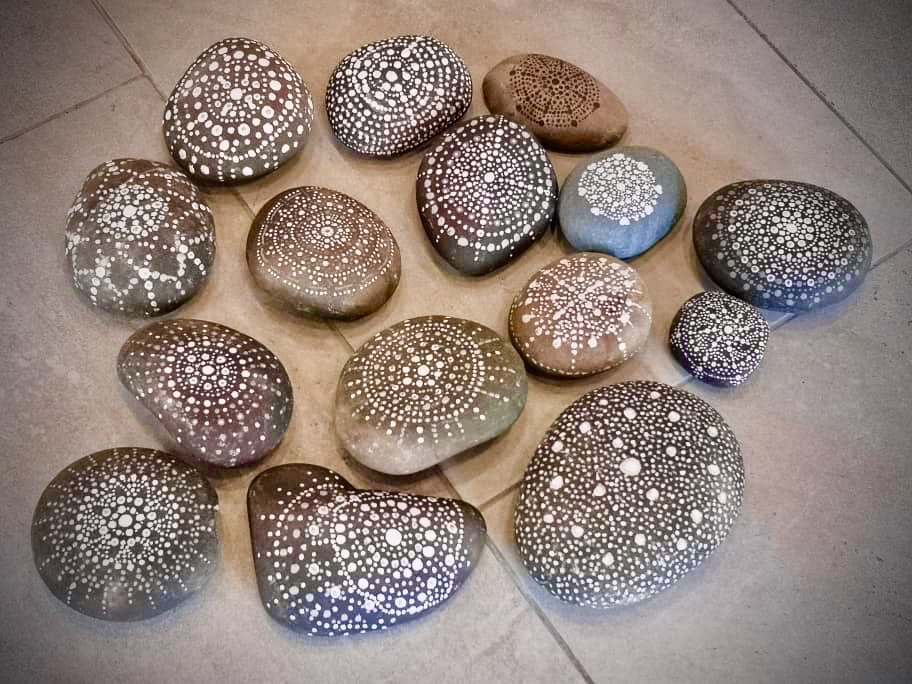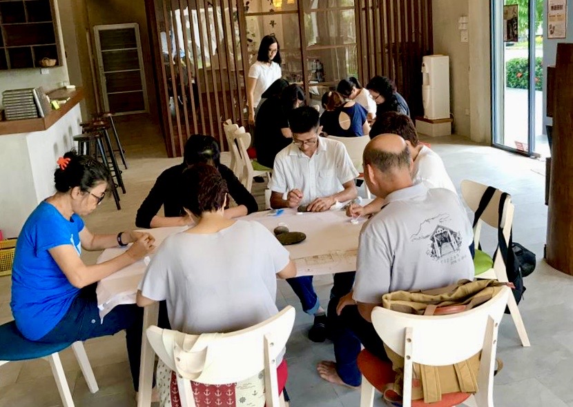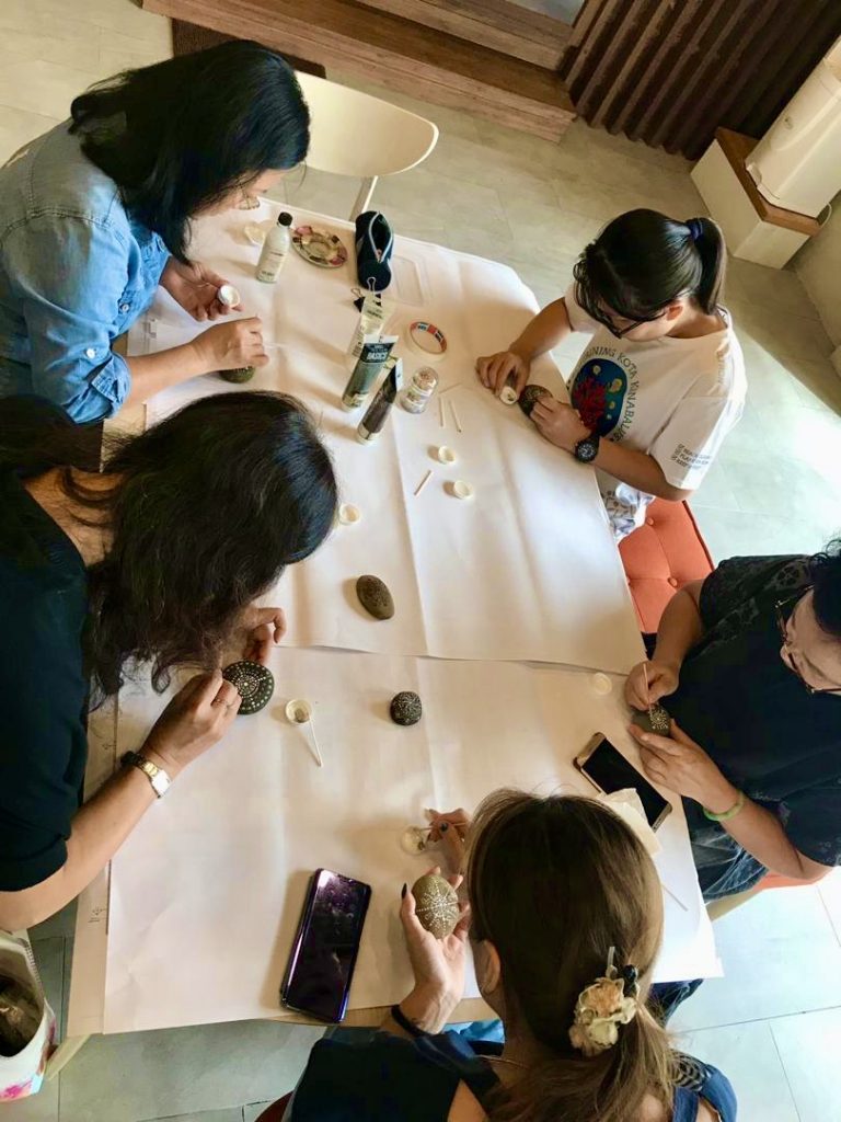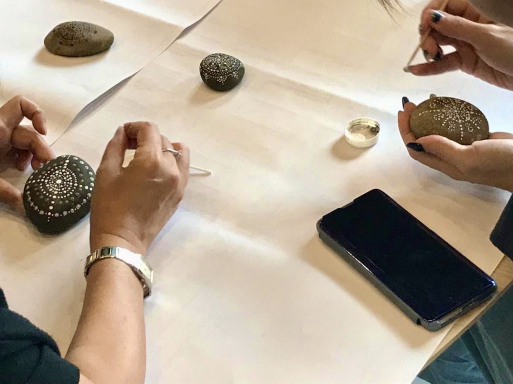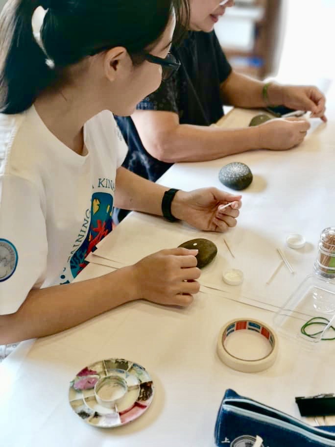 2019年12月15日,寂靜禪林文藝組舉辦【石上的內心密碼──手繪曼陀羅工作坊】,聚集了11位學員。靜宇老師簡單介紹了課程緣起後,就示範了手繪顏料在石上;有別與一般紙張或畫布。第一次接觸作畫在石上的學員,都用心的發揮創意,各自一小時內完成了作品。課程結束後,大家歡喜的彼此欣賞各自的「石上曼陀羅」及合照作紀念。