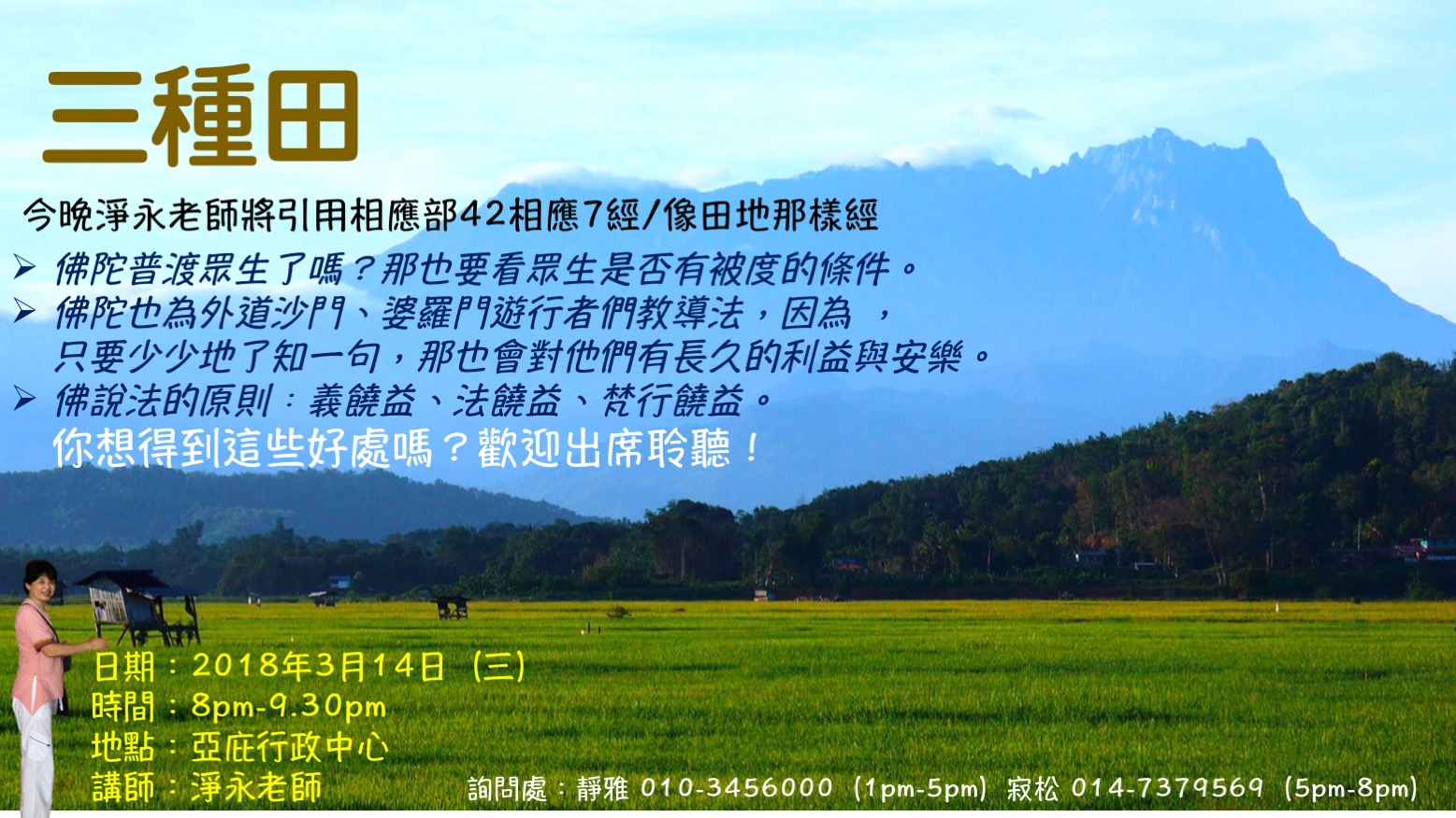 日期:2018年3月14日(三) 時間: 8pm-9.30pm 地點:亞庇行政中心 講師:淨永老師